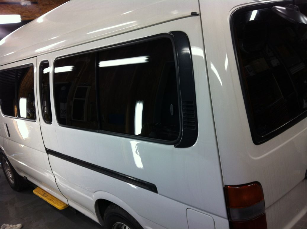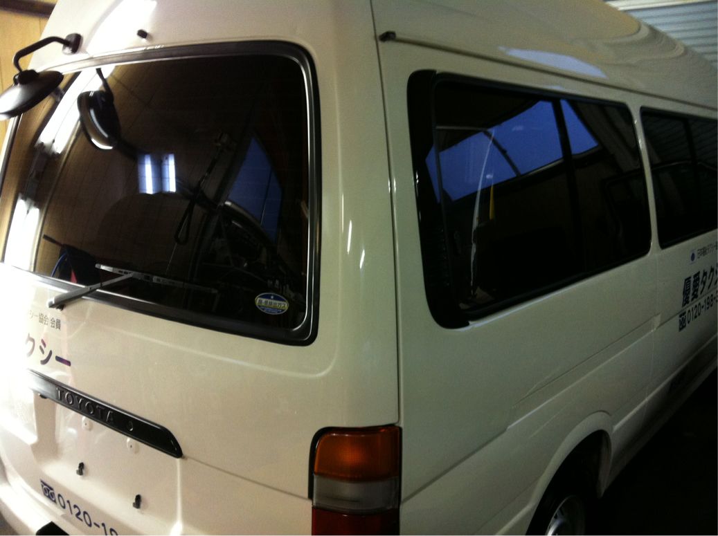 今日の100系ハイエース スーパーロング のウェルキャブ タクシーへのフィルム施工、完了しました。